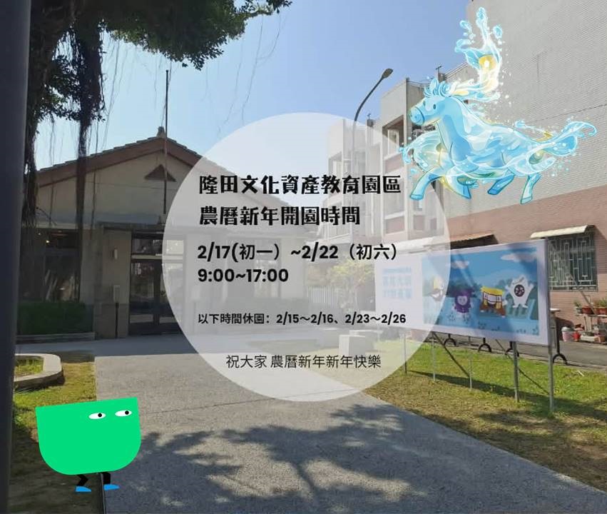 為配合農曆春節假期營運及環境保養,隆田文化資產教育園區將於下列時段休園: